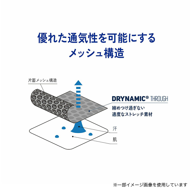 疎水性に優れ、熱伝導率の低いポリプロピレンをベースに、かさ高メッシュで編み上げることで肌面の汗を素早く吸収し、上位のベースレイヤーに拡散します。さらに汗を吸ったベースレイヤーはメッシュの厚みによって肌から遠ざけられ、肌面の冷えを防ぎ、ドライ感を保ちます。