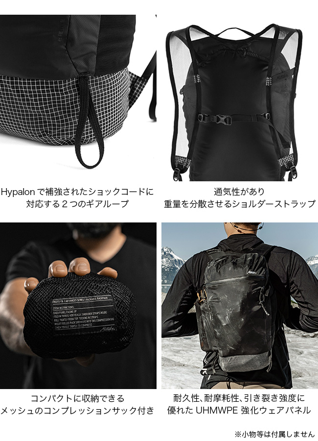 ■素材:70デニールUHMWPEリインフォーストリップストップロービックナイロン、50デニールUTSウォータープルーフミニリップストップナイロン、210デニールボンデッドナイロンスレッド