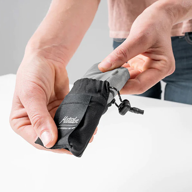 ■素材:防水PUコーティング(PFCフリー)20デニールリップストップ、100デニールブルーサイン・スパン、70デニールアップサイクルポリエステル、パラコード・ドローストリング