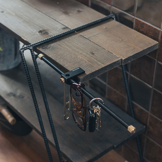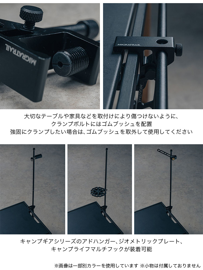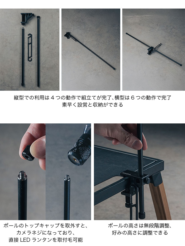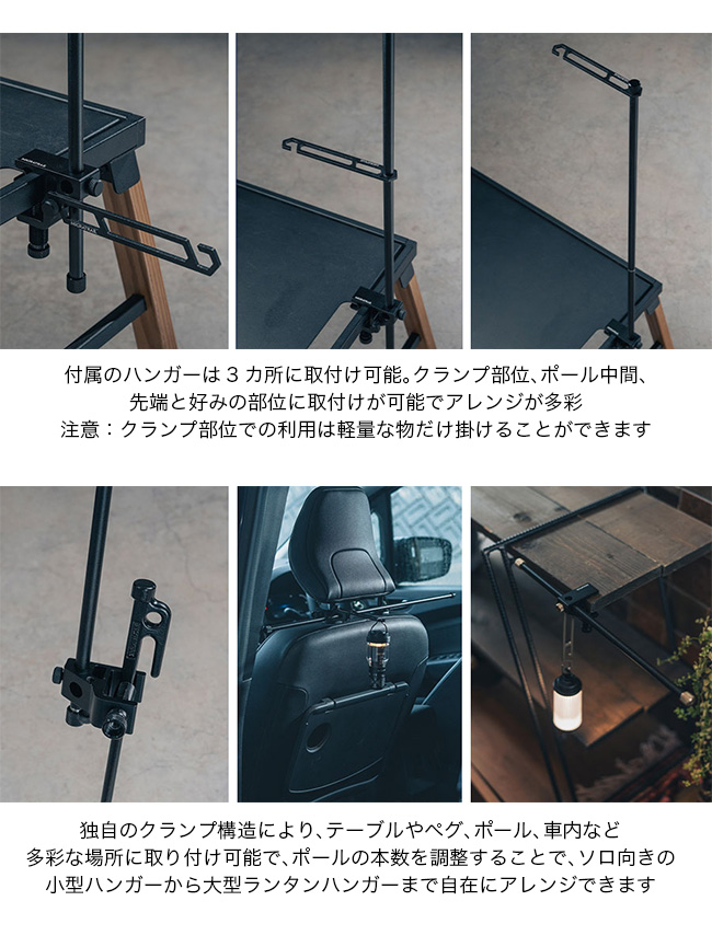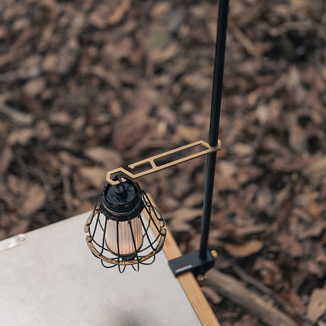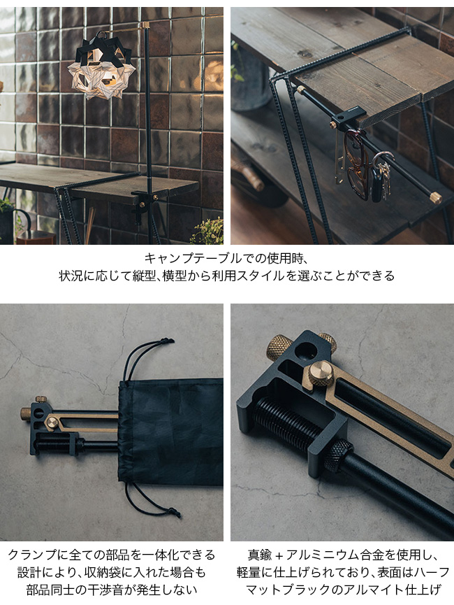 アウトドアでもリビングでも、どこでもフィットするテーブルクランプ型ランタンハンガー。ハンガーを縦にも横にも向きを変えて使用できる構造を採用。