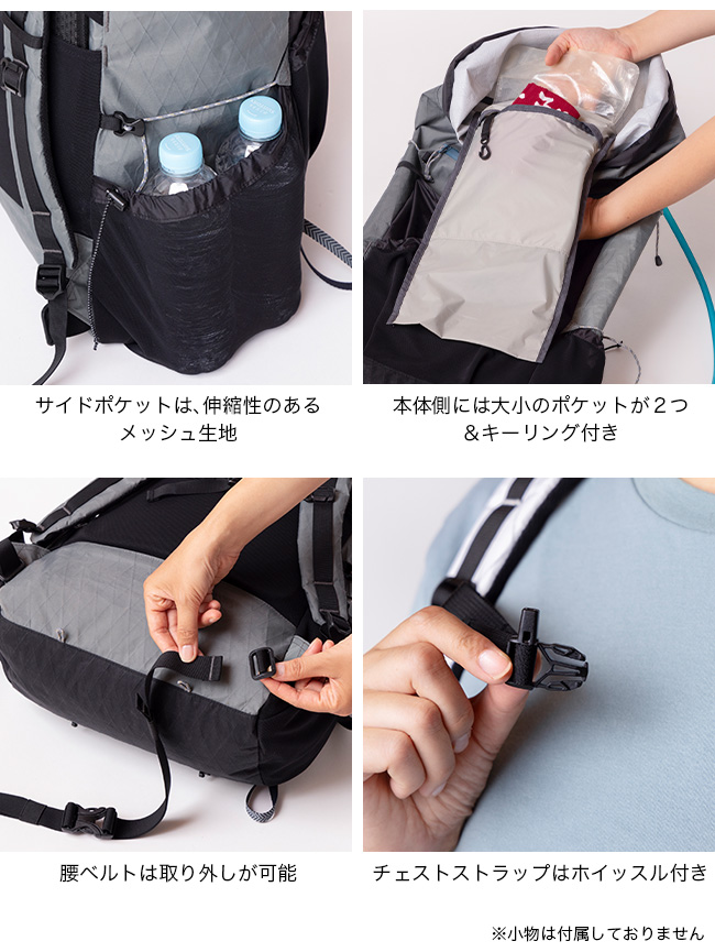 山旅を心から楽しむため、ストレスなく集中できるようにと、“ちょうどいい快適さ”を追求し、座布団として使える背面パッド、石突きの汚れを気にせず収納できるトレッキングポールポケット、着物襟のように配した2つの大きな正面ポケットなど細やかな気配りを散りばめ、作り込みました。
