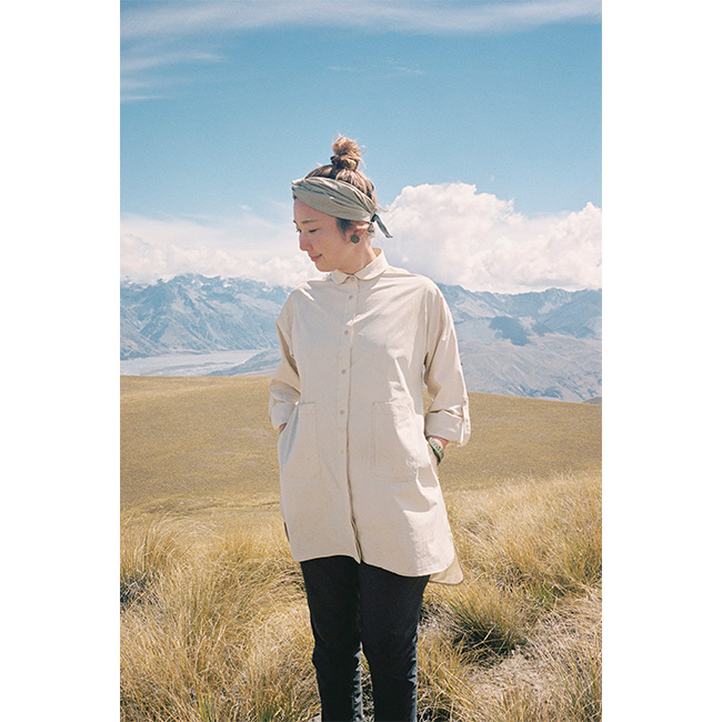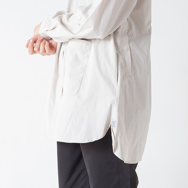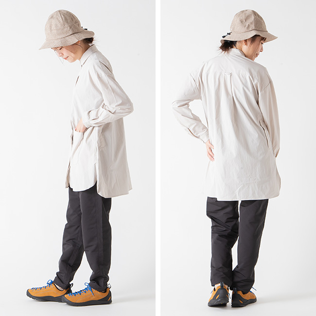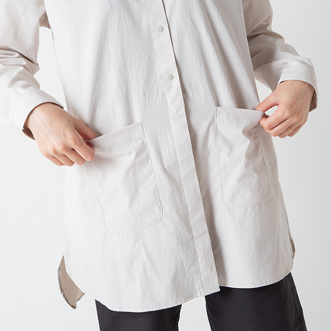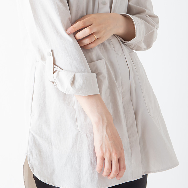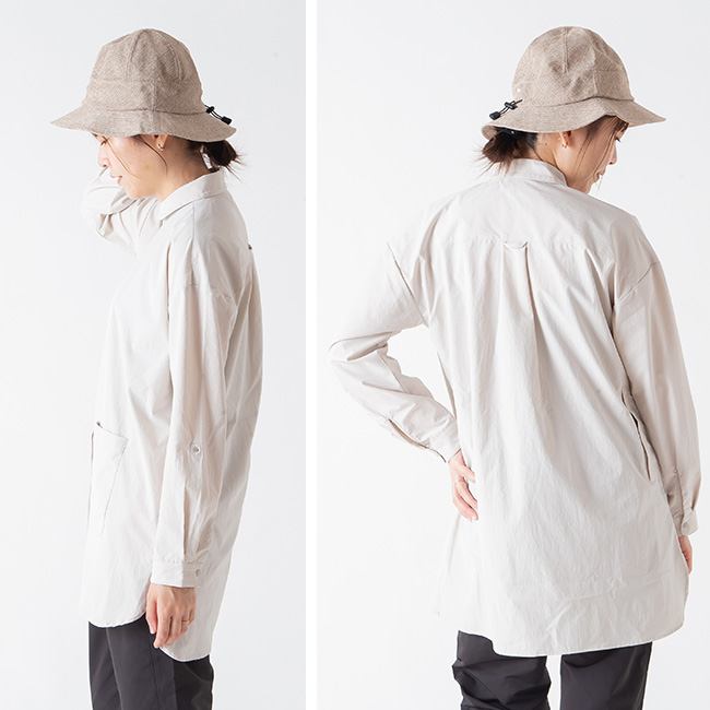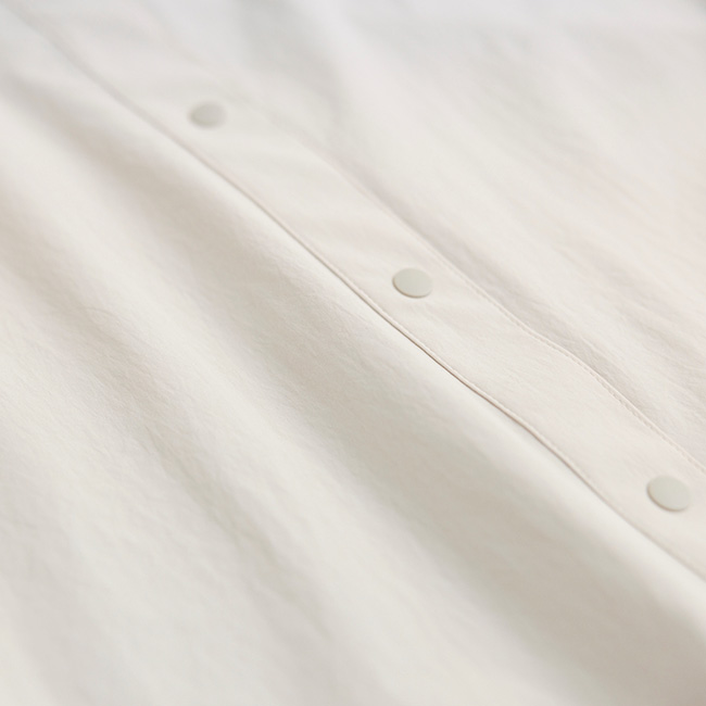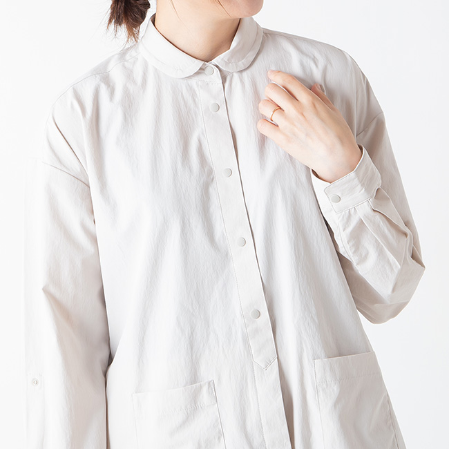 着脱が素早くできるスナップボタン仕様で、小さな丸襟は、日除け、防風に立ち上げられます。