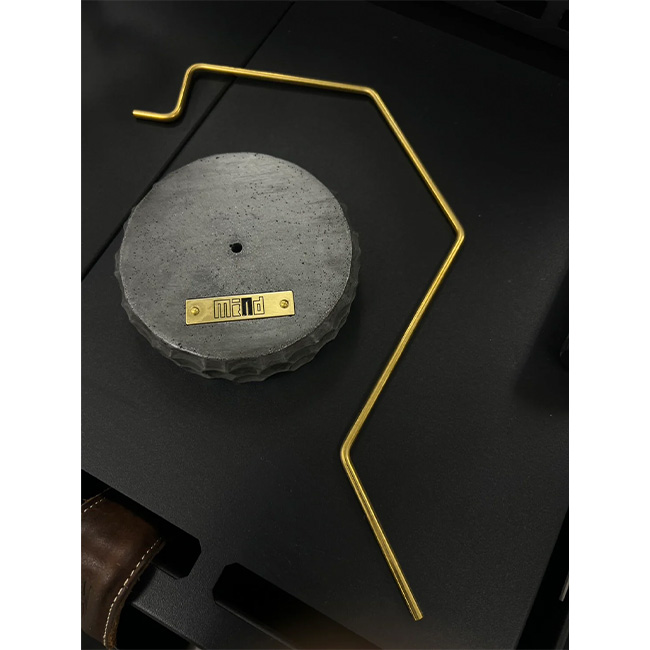 ナグリ模様を施した墨色のモルタル土台に、真鍮棒と真鍮プレートを組み合わせ、シンプルながらも存在感のあるデザインに仕上げました。モルタルならではの重厚感がありながら、直径10cmのコンパクトサイズで、デスクやテーブル上でも安定感を発揮します。