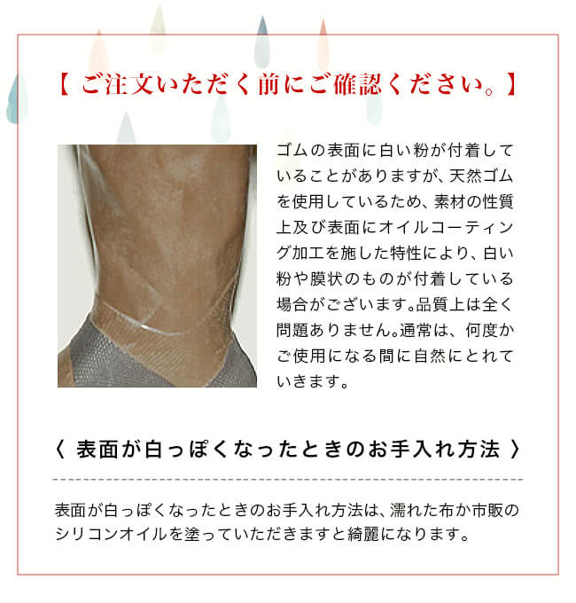 ・天然ゴムを使用しているため、素材の性質上及び表面にオイルコーティング加工を施した特性により、
