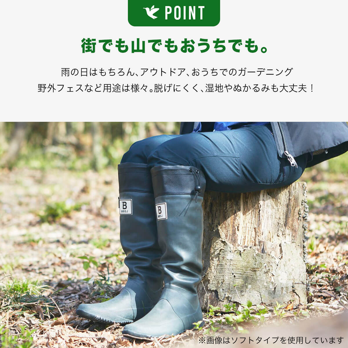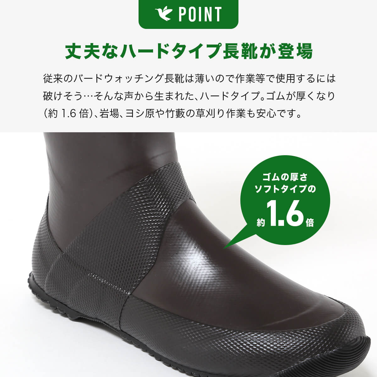 従来のバードウォッチング長靴は薄いので作業等で使用するには破けそう...そんな声から生まれた、ハードタイプのバードウォッチング長靴です。従来のバードウォッチング長靴よりゴムが厚くなり(約1.6倍)、岩場、ヨシ原や竹藪の草刈り作業も安心です。