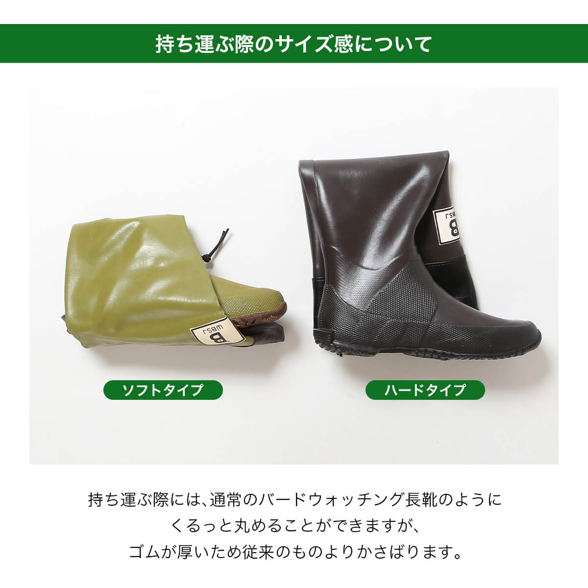 ・ゴムが厚いため、通常のバードウオッチング長靴より少しきつく感じる場合があります。