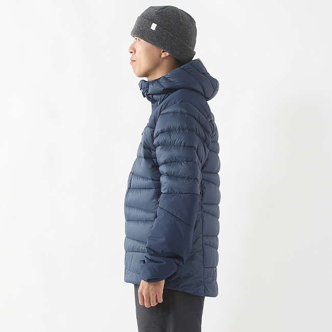 肩、側面、肘下は摩擦と圧縮によるダウンの劣化を考慮して化繊 を使用し、肩部分は内側がダウン、外側が化繊の2層構造で保温性と耐久性を両立させています。