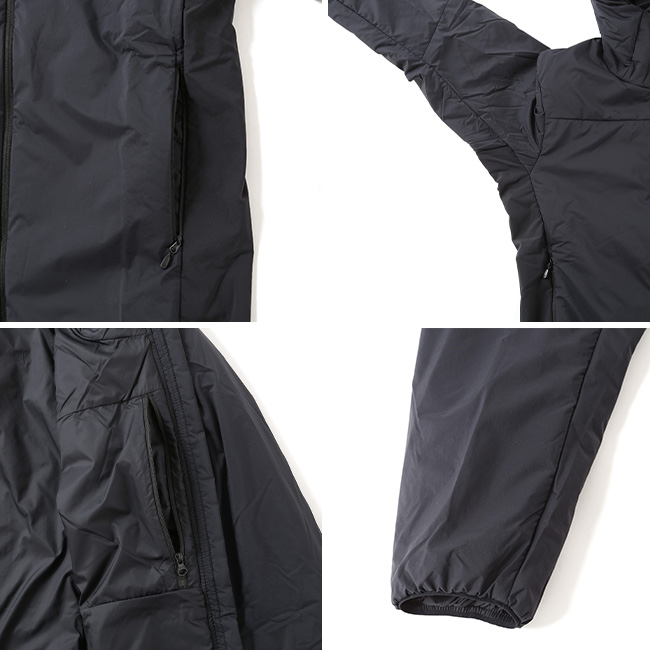ボディーに60g/m²、肘下とフードには40g/m²といった異なる厚み配置し 優れた保温性と軽量性を実現。