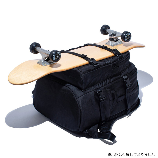 外側のストラップを活用すれば、スケートボードなどのギアをアタッチでき、アクティブな用途にも活躍します。