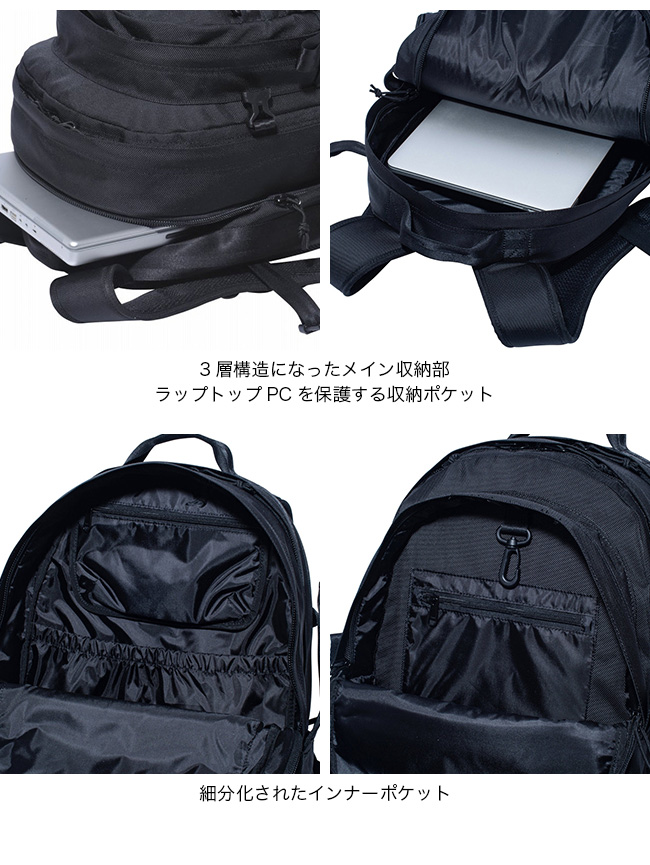 タウンユースはもちろん、アウトドアやアクティブなシーンまで幅広く対応する汎用性の高いアイテムです。メイン収納部は3層構造で、荷物を整理しやすく使い勝手の良い設計。
