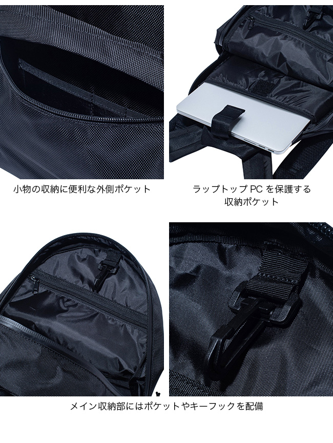 内部にはラップトップPCを保護する収納ポケットのほか、整理しやすいポケットやキーフックを備え、荷物をスマートに収納可能。