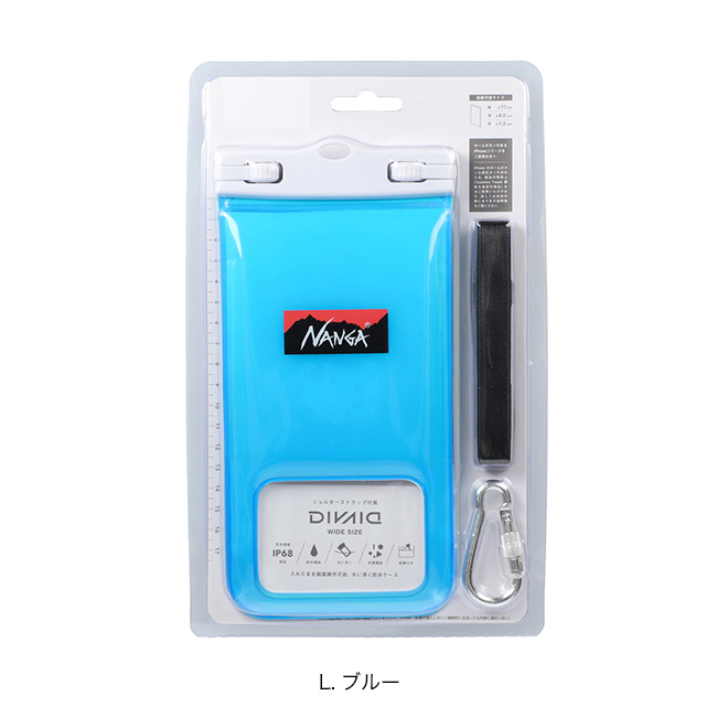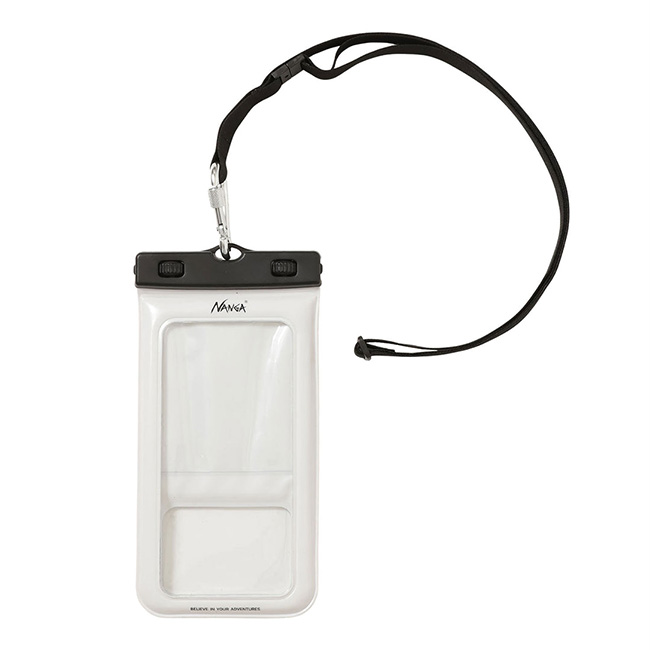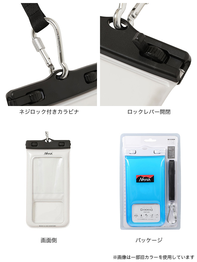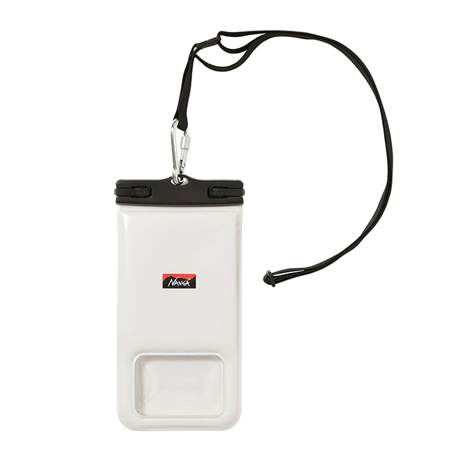 ナンガロゴが目を引く防水フローティングケース。防水性と防塵性(固形物の製品内部への侵入を防止すること)が高く、海や川、プールなどで安心してスマートフォンを携帯できます。