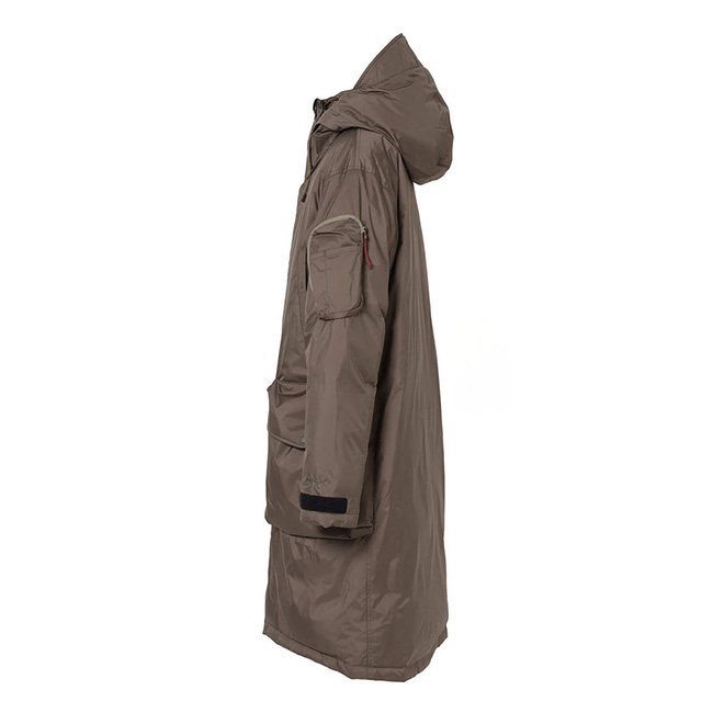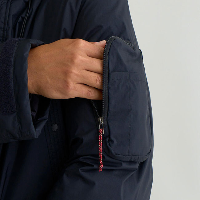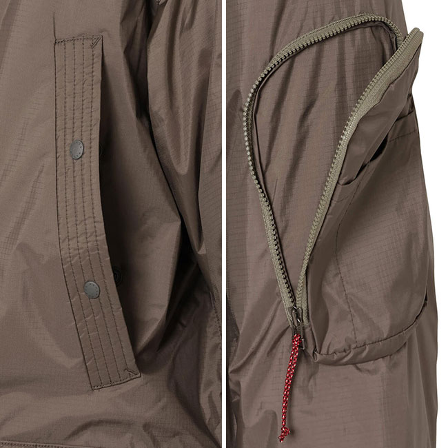 大振りのウエストポケット、胸のハンドウォーマーポケット、左腕のシガーポケットを装備