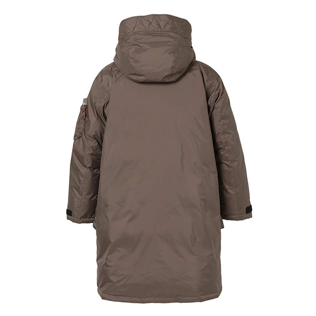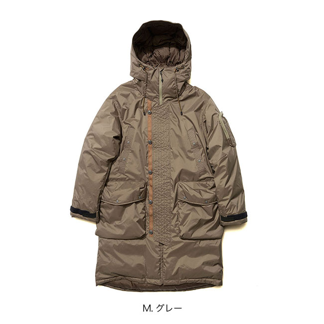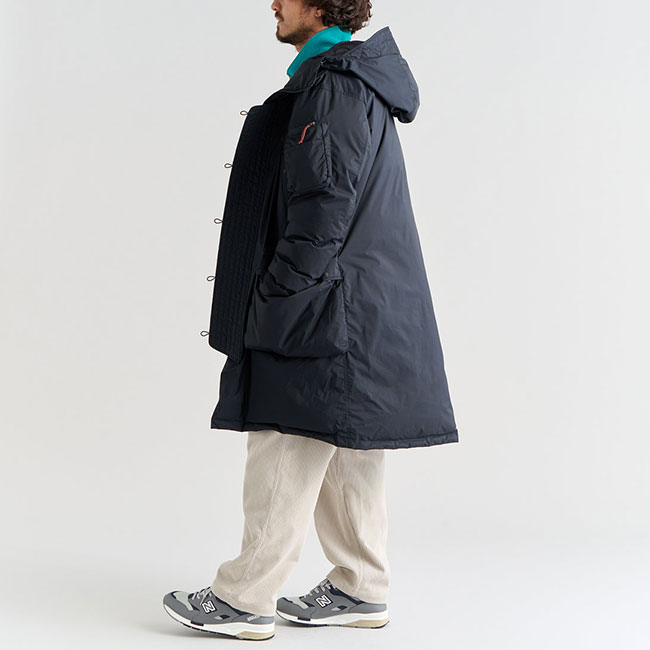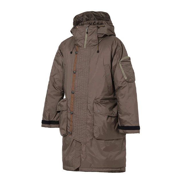 ミリタリーデザインを取り入れた、膝丈のフィールドダウンコート。
