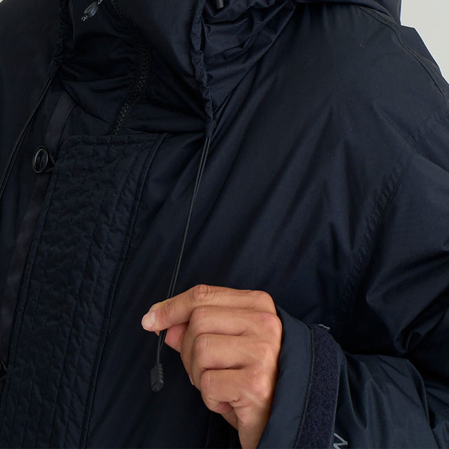胸元には手を差し込みやすい角度のハンドウォーマーポケットを配置し、内側には起毛トリコット素材を採用して保温性を高めました。