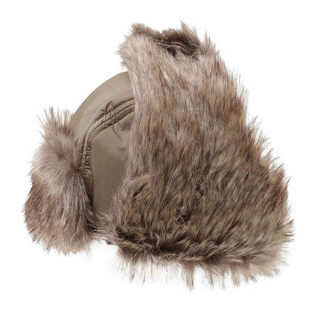 耳や顎まわりを覆うイヤーフラップは、下ろして使えば高い防寒性を発揮し、上げて留めればスタイリングのアクセントに。