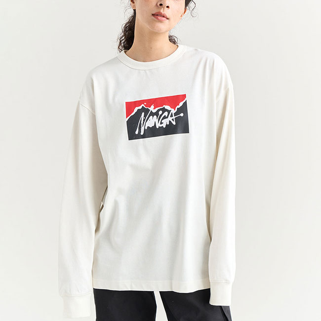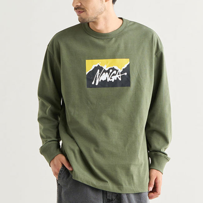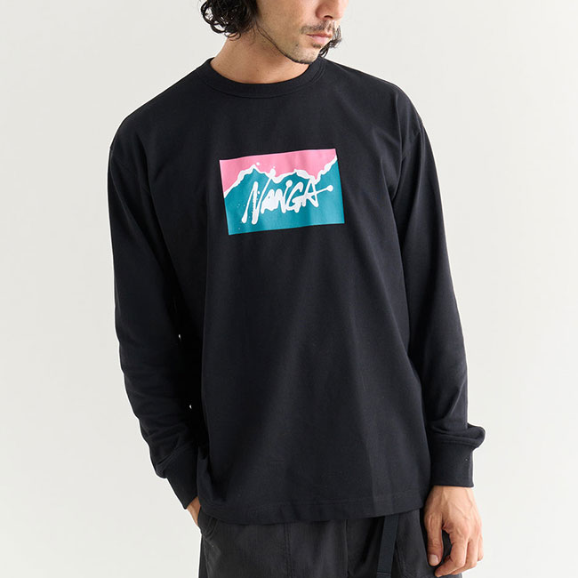 NANGAのブランドを象徴する「ナンガ ボックスロゴ」をベースに、神山隆二氏がアレンジを加えた特別なグラフィックロンT。ナンガパルバットの稜線とブランド名を、スプレーで描いたような躍動感あふれるタッチで表現しました。
