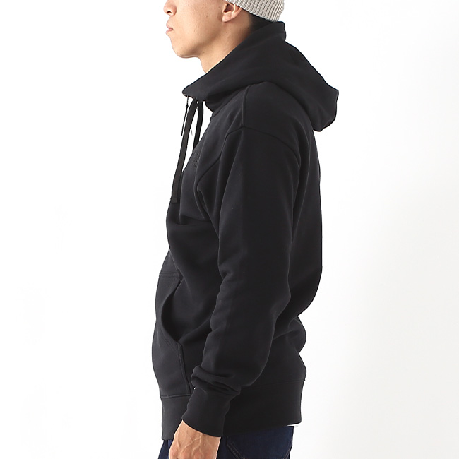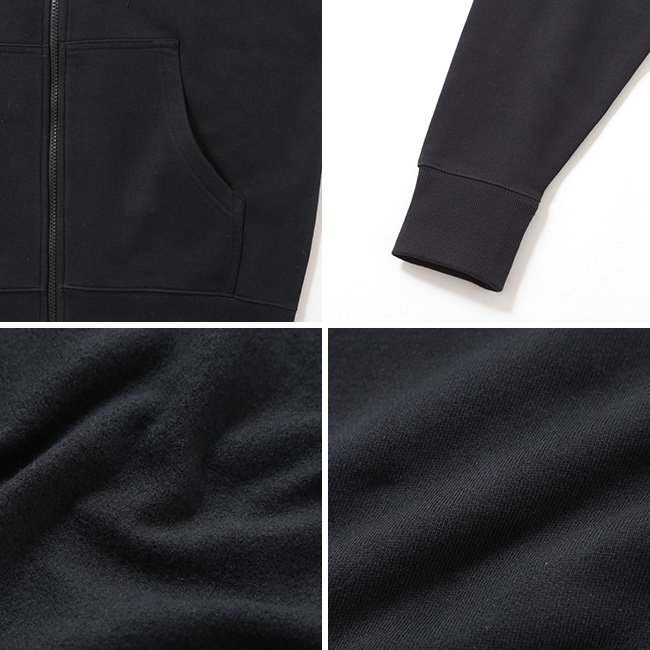 乾きやすさを考慮し、リサイクルポリエステルを混紡しています。フード部分のロゴは立体刺繍で表現。