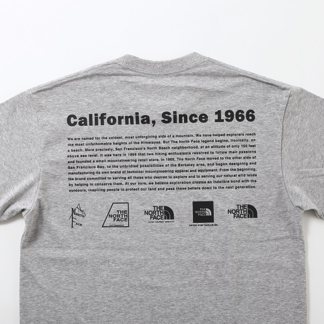 風合いのよいコットンライクな生地は、柔らかくしなやかな肌触りです。THE NORTH FACEの歴代のロゴを年代順に並べ、ブランドの歴史を記しています。