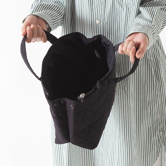 電子機器やその周辺アクセサリーの収納に便利な自立型のトートバッグ