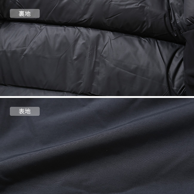 リサイクルナイロンを使用した防水透湿素材のハイベントを2層構造で使用。中わたには湿潤時の機能消失が少ないはっ水加工を施したプロダウンを採用し、濡れが生じる場面での機能維持に貢献します。