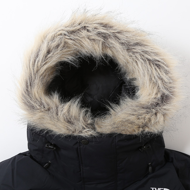 フードはやや大きめで、取り外し可能なボリュームあるシンセティックファーを装備。