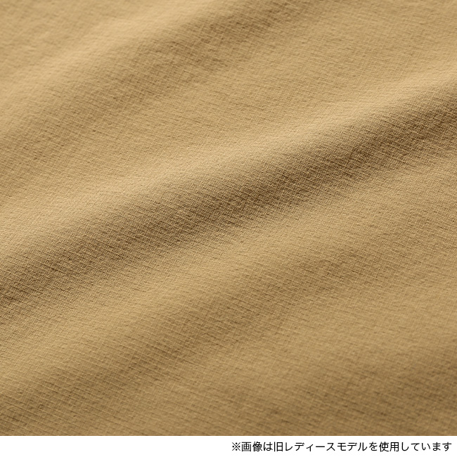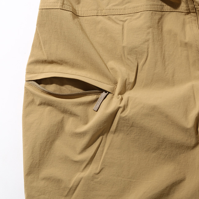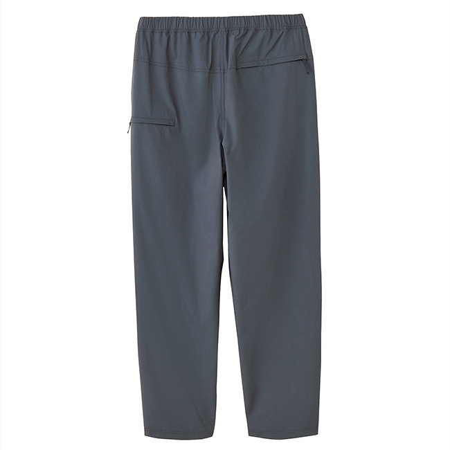 一部リサイクルナイロンを使用したリップストップ生地はストレッチ性と適度なハリ感があり、はっ水加工を施しているため多少の雨は弾きます。脚さばきが快適なテーパードシルエットで、左サイドには地図が入るサイズの縦長のポケットを配置。