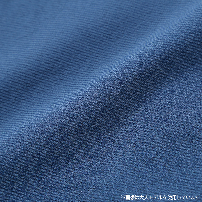 リサイクルポリエステルを一部使用した生地は、適度なシャリ感があり、さらりとした着心地です。独特のメッシュ構造を採用することで衣服内のムレを軽減し、高い通気性を実現しています。