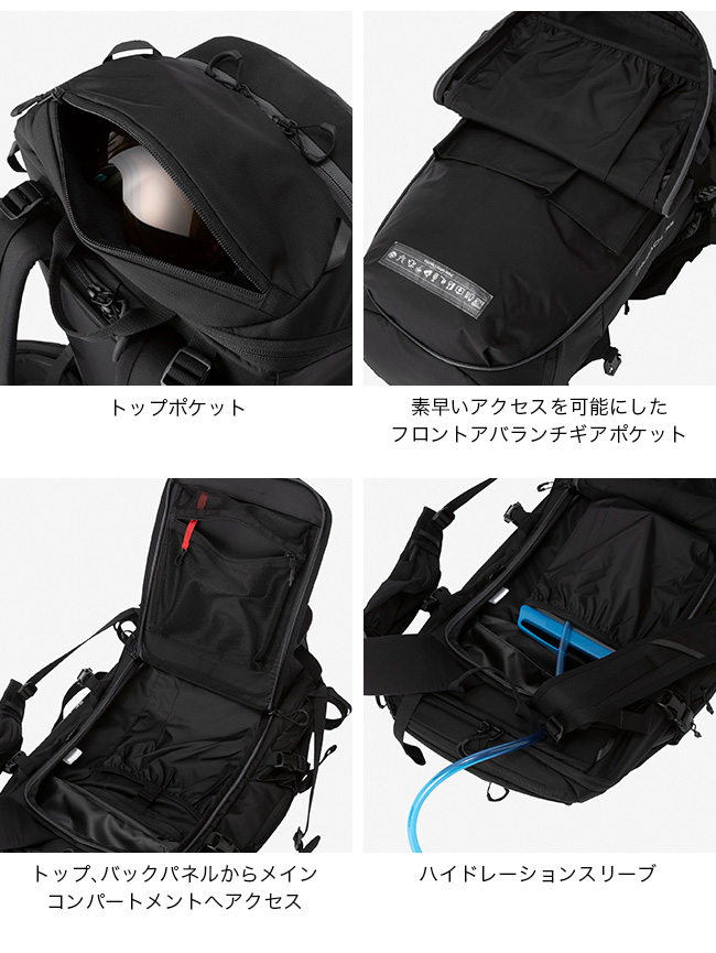 素早いアクセスを可能にしたフロントアバランチギアポケット・大きな開口部・シャベルブレード収納ポケット・3か所のシャフトスリーブ