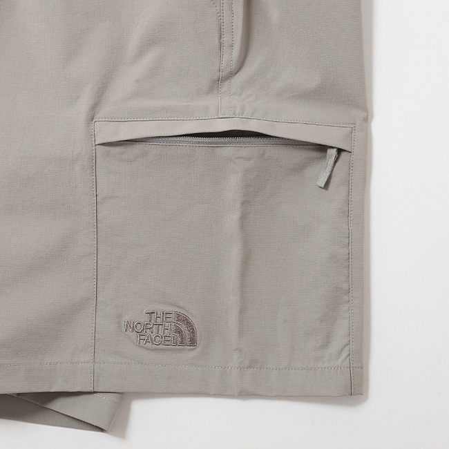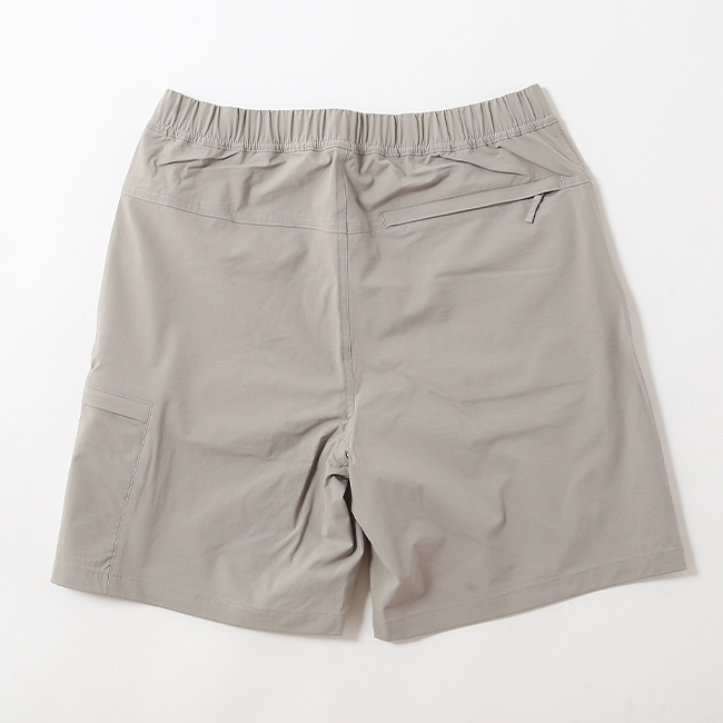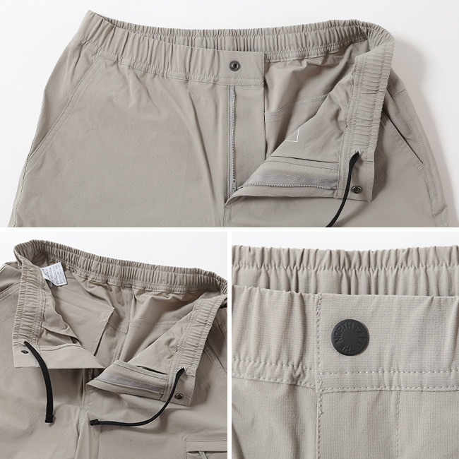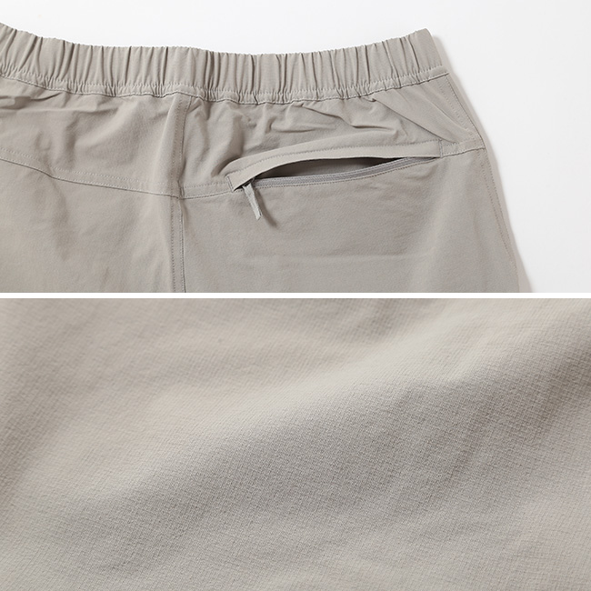 一部リサイクルナイロンを使用したリップストップ生地はストレッチ性と適度なハリ感があり、はっ水加工を施しているため多少の雨は弾きます。脚さばきが快適な丈感で、両サイドには地図が入るサイズのスラッシュポケット、左脇にはファスナー付きのカーゴポケット、さらに右ヒップにもファスナーポケットを配置し、収納力を高めています。