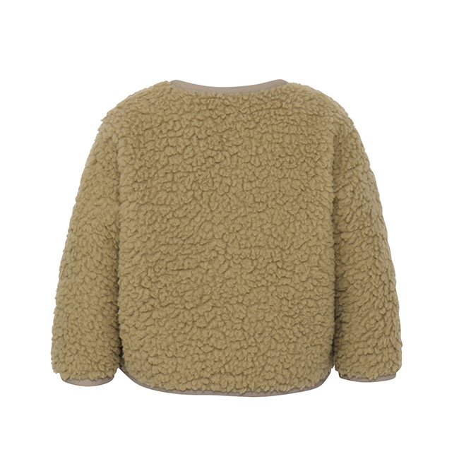 表面にはかさ高があり柔らかな毛足のボアフリース、肌面には滑らかな肌触りのマイクロフリースをボンディングした生地を採用しています。フロントはドットボタンで着脱がしやすく、袖口や裾、襟はすっきりとしたパイピング仕様です。