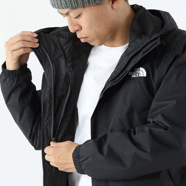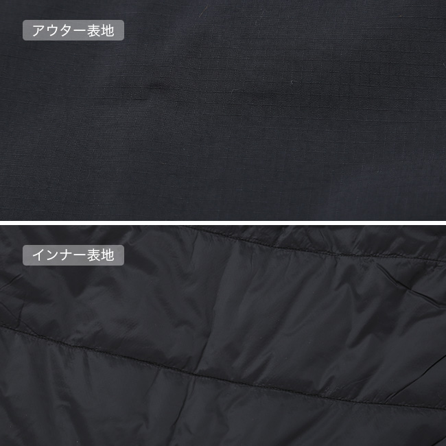 インナージャケットとアウターはフロント内部のファスナー袖口と首元のスナップボタンで連結して着用することも、それぞれを単体で使用することもできます。アウターは防水透湿性を持つ2層構造のナイロン素材を採用。