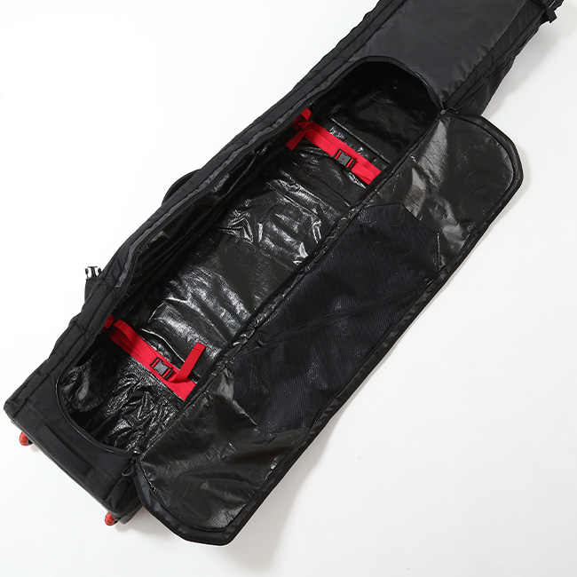 スキーやスノーボードの長さに合わせて調整可能(145~195cm)で、スキー2組またはスノーボード1枚とスキー1組を収納可能。