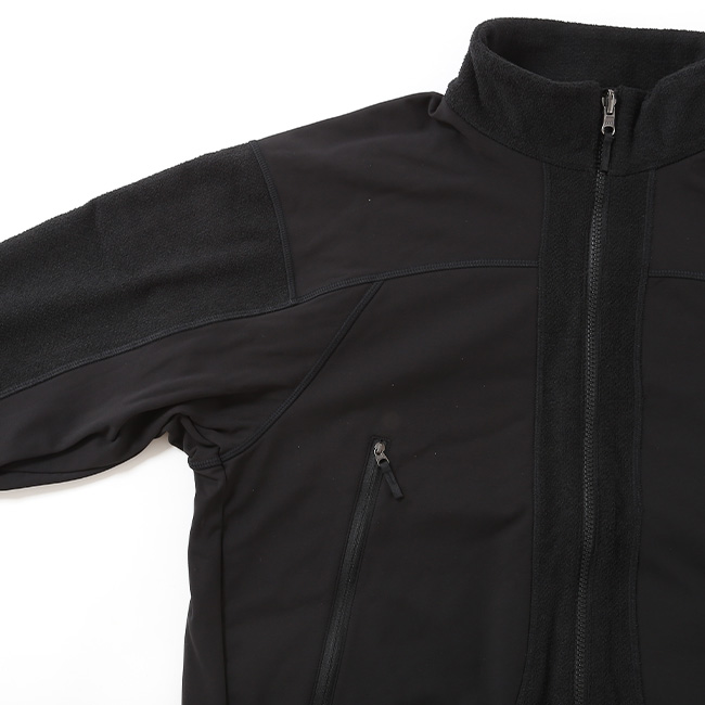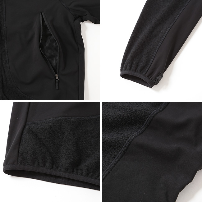 軽量でしなやかなポリエステルスウェット素材をベースに、ムレやすい部分には通気性に優れたフリース素材を切り替えて配置。行動中も衣服内を快適に保ちます。