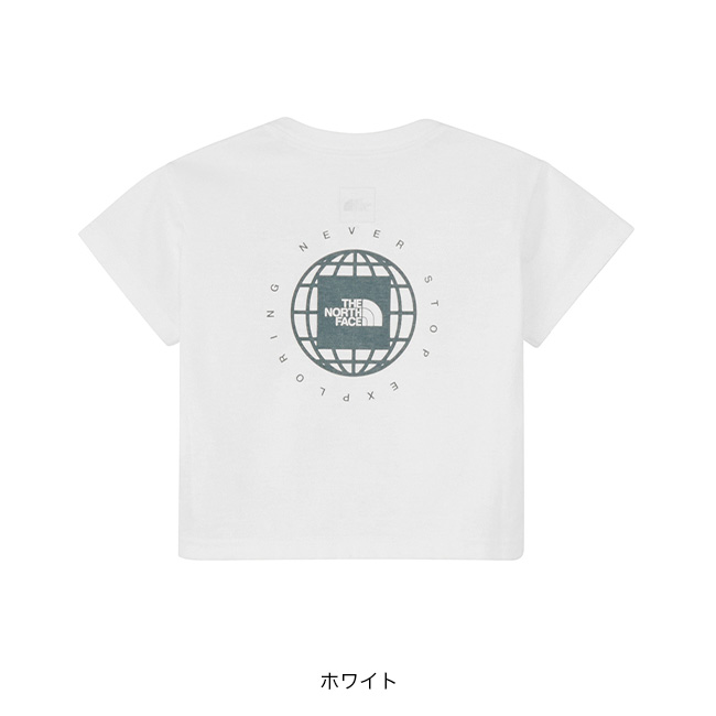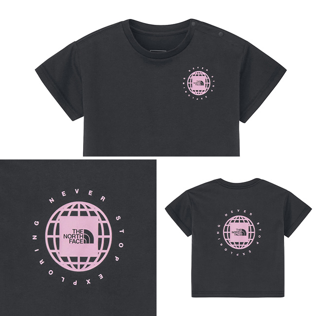 地球儀モチーフとスクエアロゴを組み合わせた、印象的なプリントを背面に大きく配置した、ベビー用半袖Tシャツ