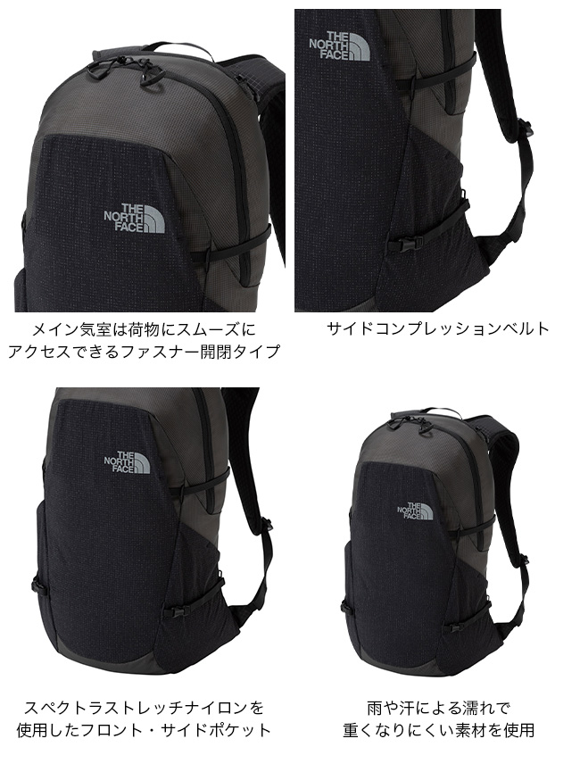 雨や汗で濡れても重くなりにくい、保水しにくいモノフィラメントリップストップナイロンを採用した軽量デイパック。日帰り登山に最適な18L容量で、夏山からスノーハイキングまで幅広く対応します。