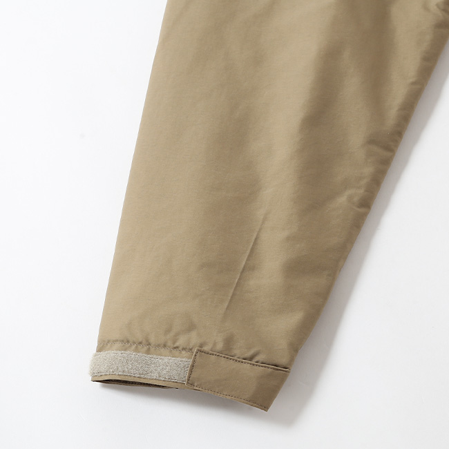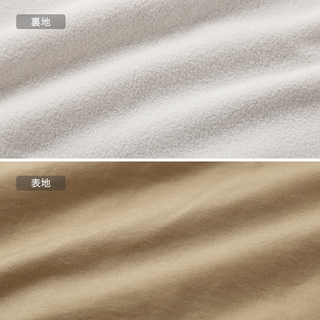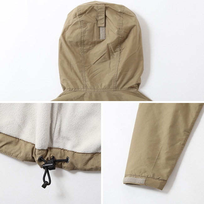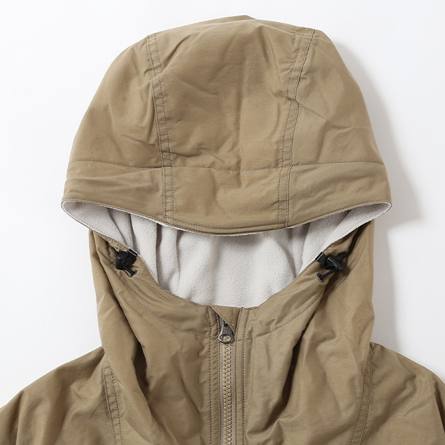 表地にはっ水加工を施しているので、多少の雨や雪に対応します。身頃とフードの裏地は肌触りがよく保温性もある毛足の短い100マイクロフリース。