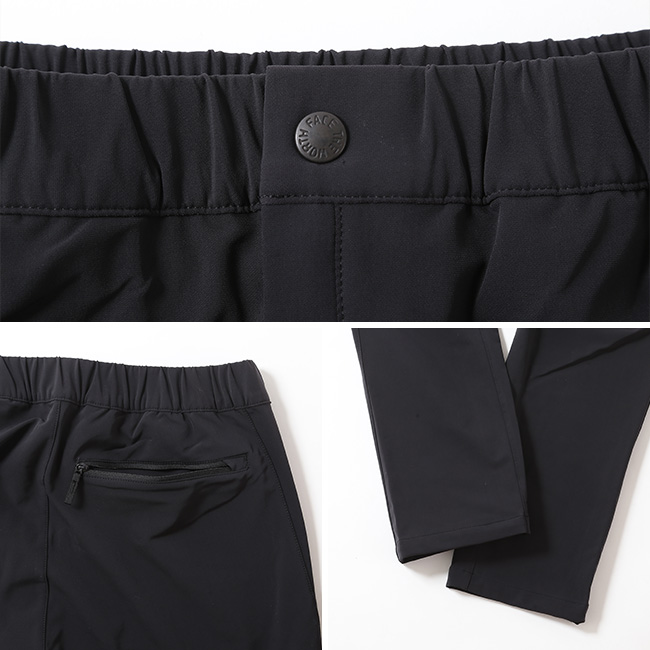 ポリウレタンとリサイクルナイロンを一部使用した混紡生地は、高いストレッチ性を持ち、ニットのような伸縮性と着心地のよさが特徴です。テーパードシルエットでありながら、立体的なパターンで脚上げがスムーズにできます。
