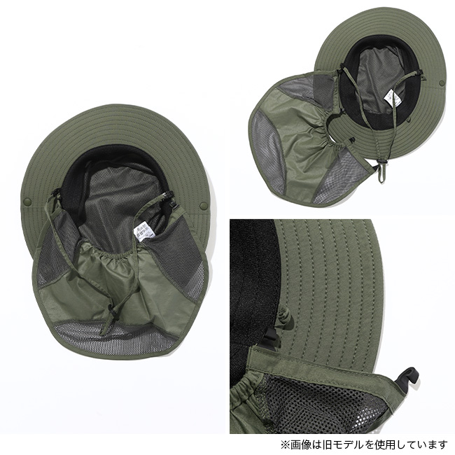 フックで簡単に取り外せるサンシールドは、首まわりの日焼け対策に有効。本体には、はっ水加工を施した軽量なナイロン素材を使用しています。