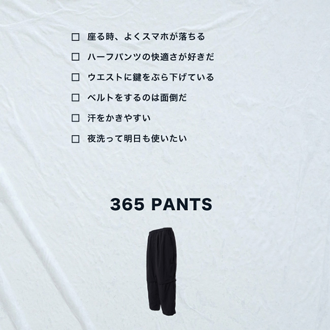直感的に使う機能だけを揃えたデイリーウェアを展開する、ノーマルエキスパート。365パンツは、その名の通り1年365日の着用を想定した、短パンとしても使えるテックパンツです。