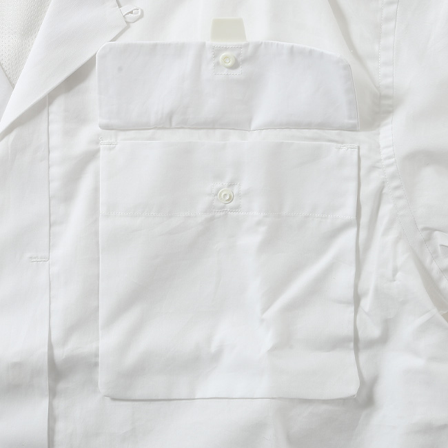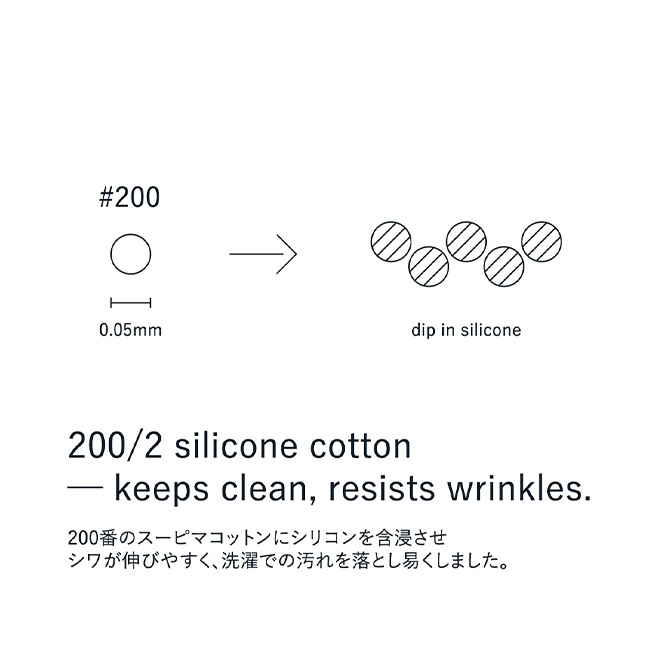 200番のスーピマコットンにシリコンを含浸させ、シワが伸びやすく、洗濯での汚れを落とし易い素材で作られたシャツです。シリコンが含まれていることで、汗で肌に張り付くことが少なく、サラッとした肌あたりに仕上がっています。