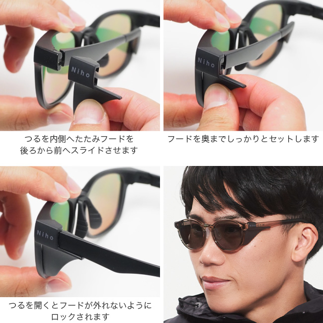 アウトドア用のサングラスは光の侵入を防ぐために顔をグルっと覆うようなスポーティーなデザインが多く、街中で着用するのはちょっと・・・という悩みがありました。Nihoはサイドフードをワンタッチで着脱できる構造のため、山はもちろん、普段使いでも積極的に着用できるデザイン(特許構造)を実現しています。
