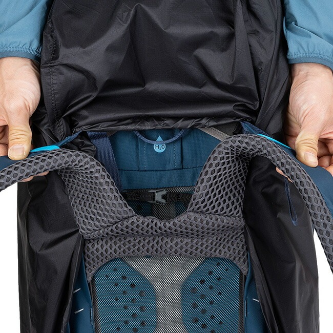 上部のバックルとヒップベルトのバンジーコードにより、強風でも外れにくい構造。小さなスタッフサックに収納でき、必要なときに素早く展開して装着できます。
