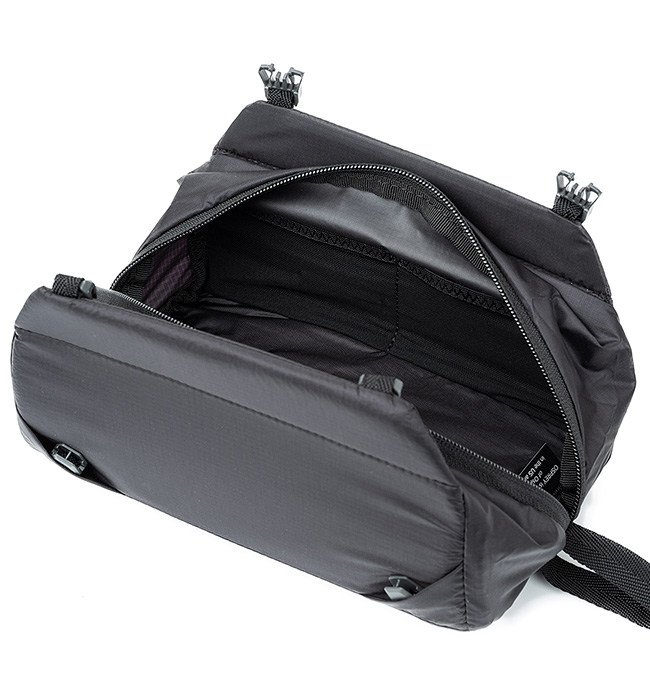 調節可能なダブルコンプレッションベルトで、中身の多少にかかわらず、しっかりと圧縮~保持してくれる万能ポーチです。