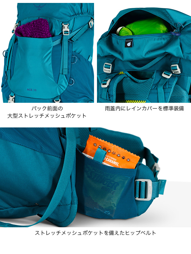 大人向けパックと同等の機能や快適性を備え、若い冒険家の背中に寄り添います。エース38は、小屋泊まりの登山やハイキング、キャンプ、旅行などに適した容量。
