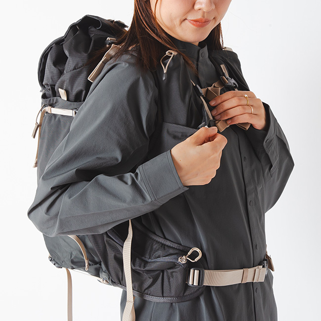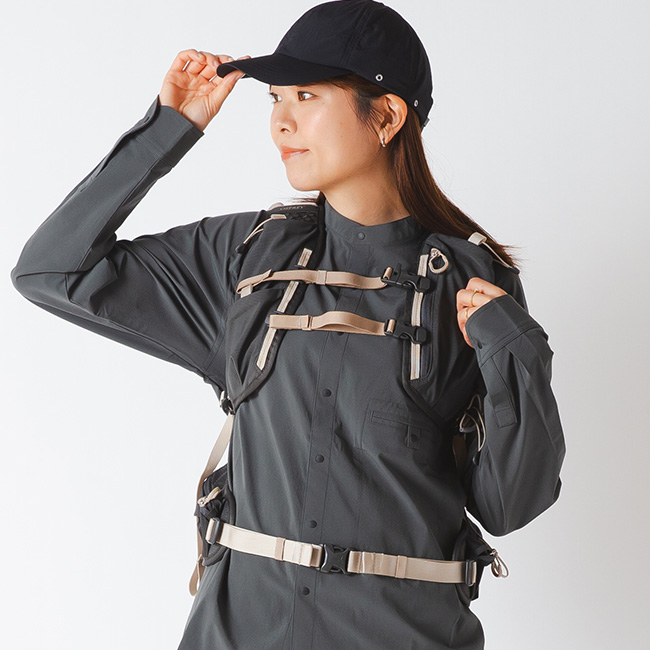 ショルダーハーネスはもちろんのこと、ヒップベルトや本体のサイドなど豊富な収納スペースが備えられて、行動中に立ち止まりたくないプレイヤーに最適なパックです。