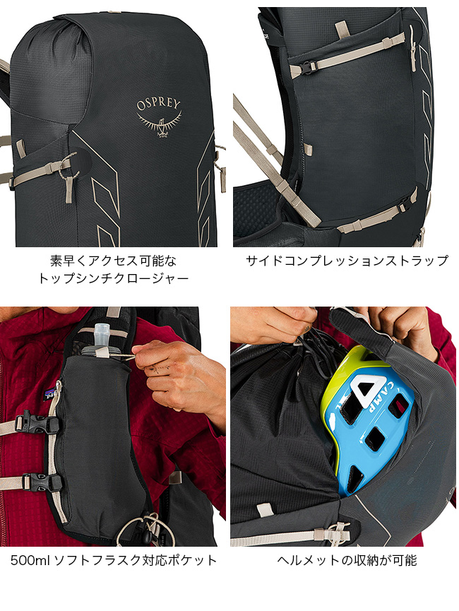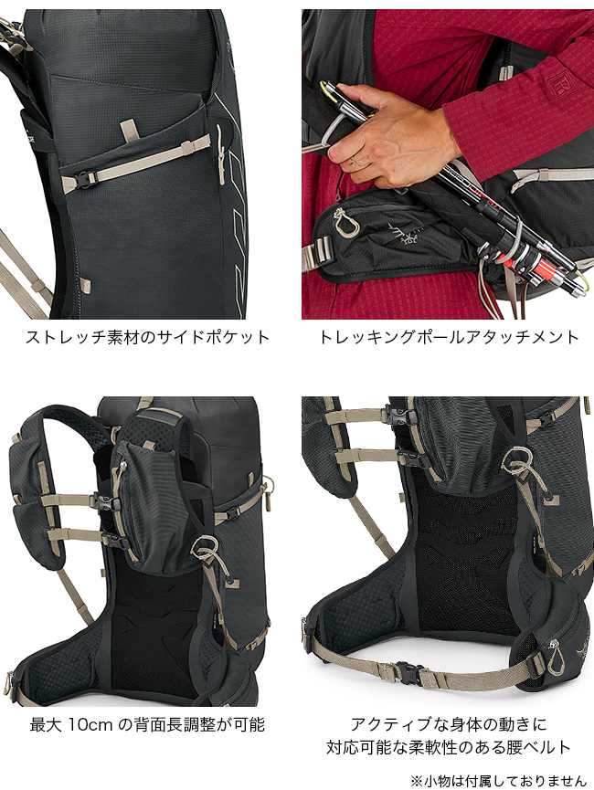 ヘルメットやアイスアックス、トレッキングポール、スリーピングマットなどが収納でき、ファストハイキングはもちろん長距離のトレイルランニングや自転車・スキーなど、スピードを重視する様々なアクティビティに対応します。