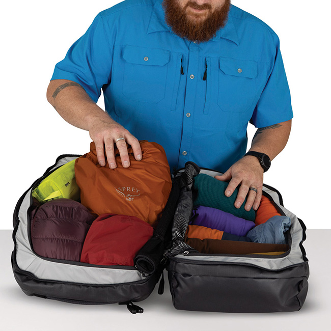パックの上部からもアクセス可能なデュアルエントリーで、パック真ん中の仕切りを使わない時は丸めて収納することもできるため、1気室から3気室まで変えられる汎用性の高いデザイン。