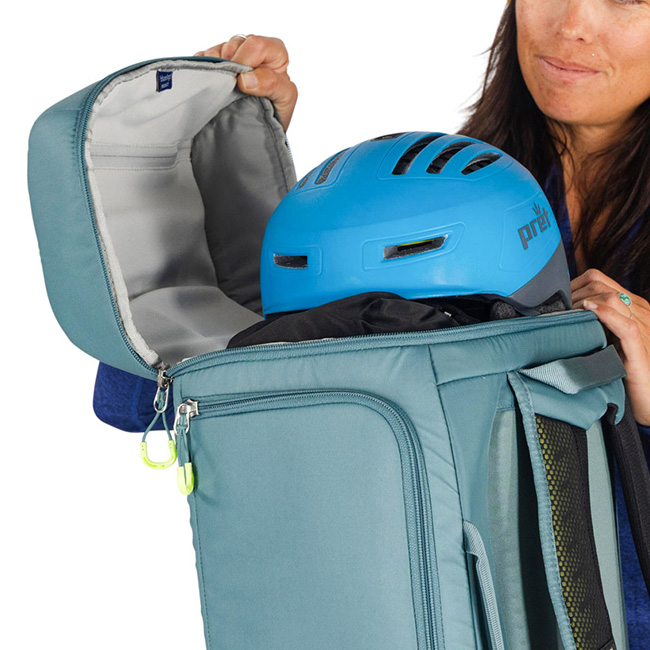メインの生地には耐久性と耐水性に優れたナノタフを使用し、パック全体に施されたパッドで大切なギアを保護します。ブーツの脱ぎ履きに便利なシューズチェンジマットを装備しています。
