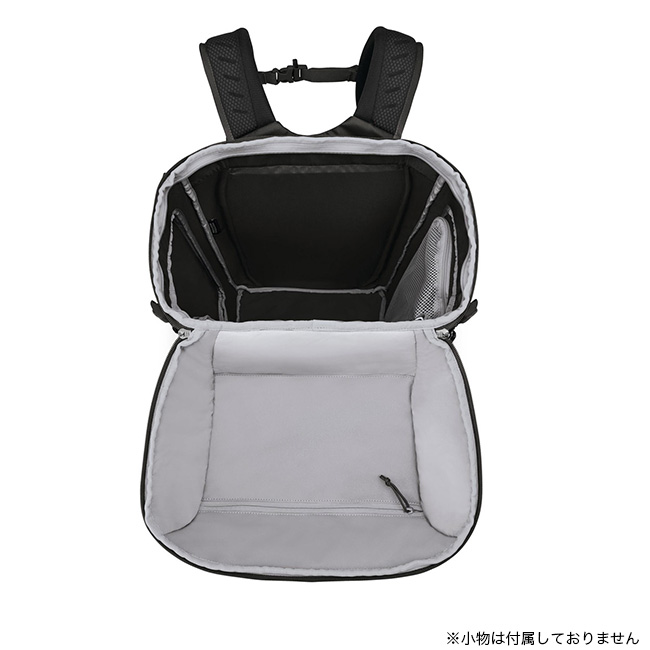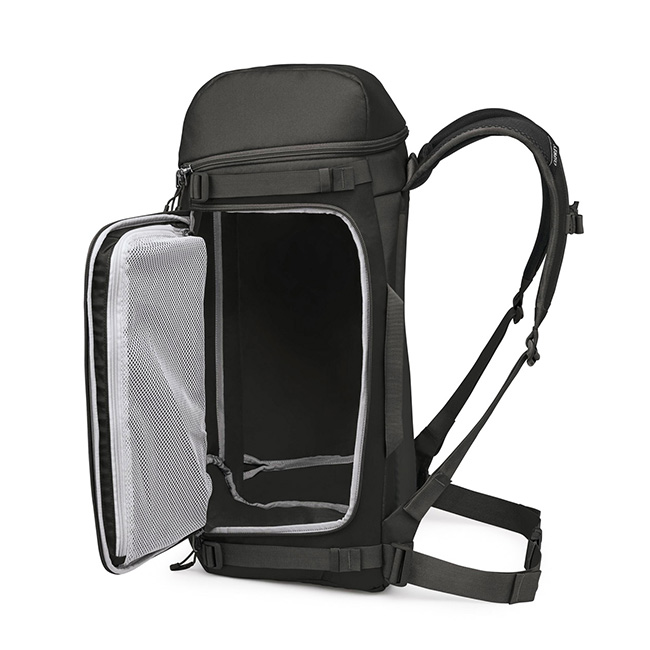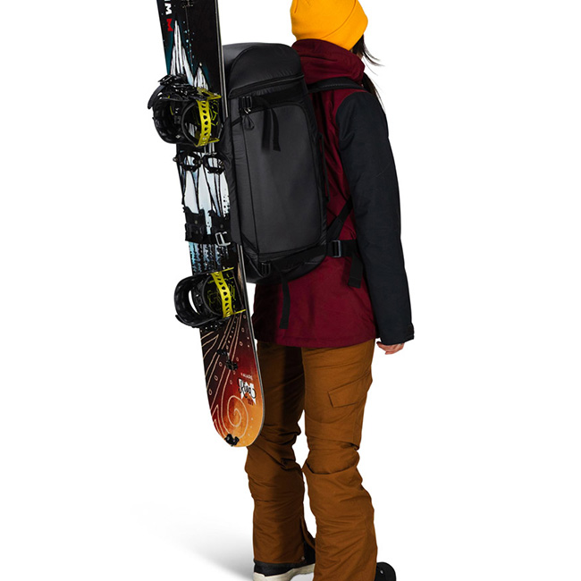 サイドにスキーキャリー、フロントにスノーボードキャリーを備えており、板を取り付けて運ぶことが可能です。メインコンパートメントには左右のどちらからもアクセスが可能。